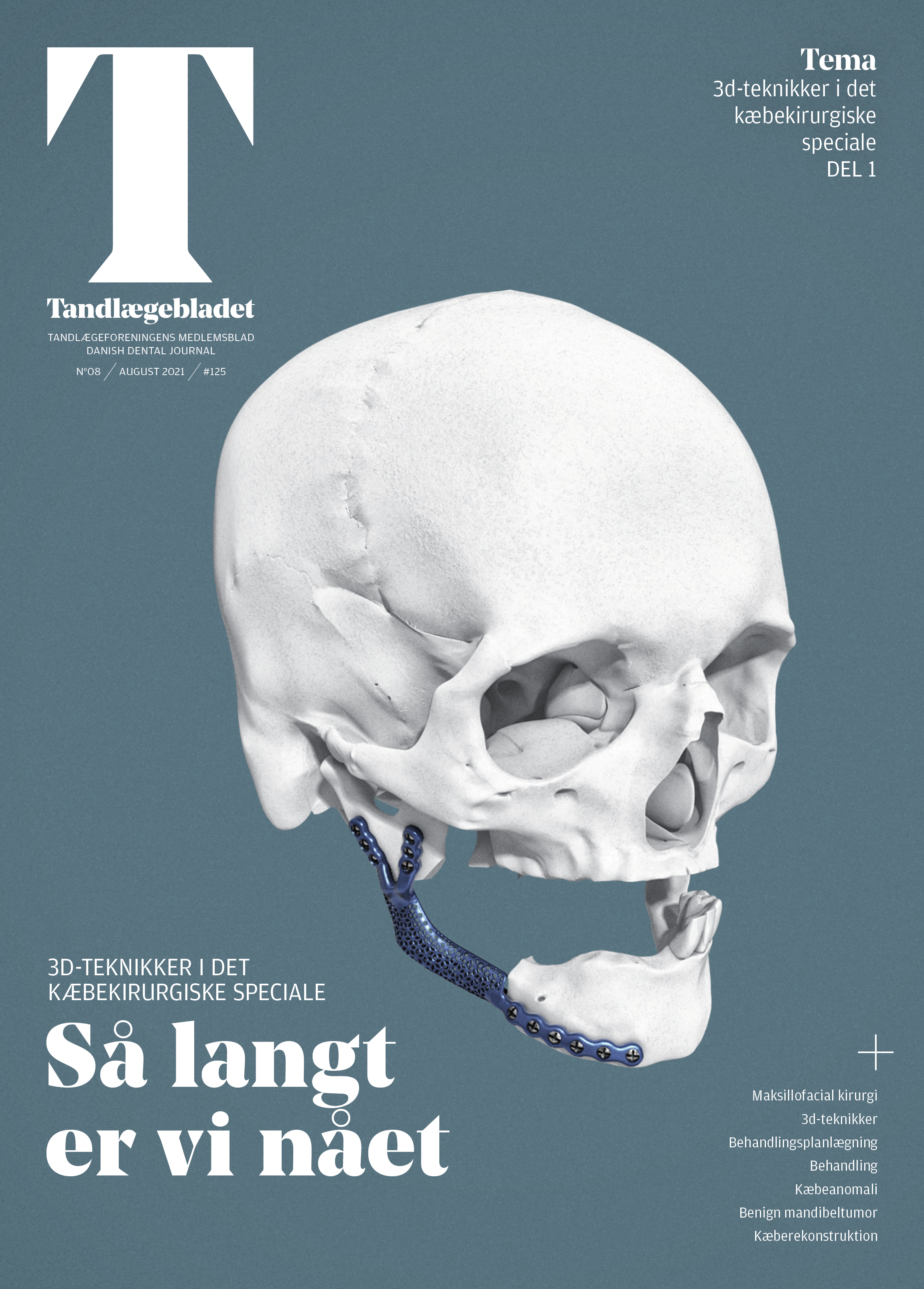 36-årig mand blev i forbindelse med fund af displaceret tredjemolar og cystelignende opklaring i mandiblen henvist til Tand-, Mund- og Kæbekirurgisk Afdeling, Aarhus Universitetshospital med henblik på diagnostik og behandling. Histologisk undersøgelse viste etmyxom. Der blev foretaget resektion med samtidig fjernelse af 8, 7, 6, 5, 4-. Efterfølgende udførtes rekonstruktion med fibula.