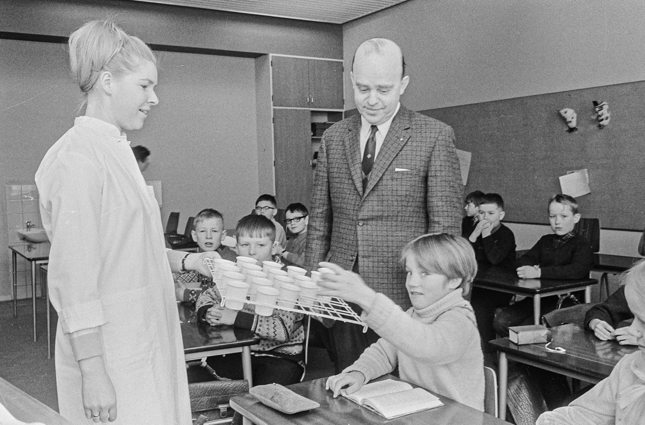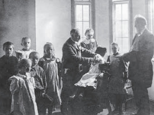 En komité nedsat af Dansk Tandlægeforening står bag en undersøgelse af 10.000 skolebørn i København, der konkluderer, at 93 % af børnene har caries. Samme år startede den første danske skoletandlæge i Svendborg på privat initativ af Marinus Kiær, der ses på billedet her.