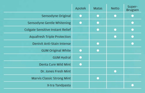 Tandlægebladet foretog i oktober en stikprøve i fire butikker i indre København for at se, hvor mange tandpastaer på det danske marked, der indeholder titaniumdioxid. Stikprøven viste, at ud af 23 tandpastaer, indeholdt halvdelen det potentielt kræftfremkaldende stof (se faktaboks på næste side).
