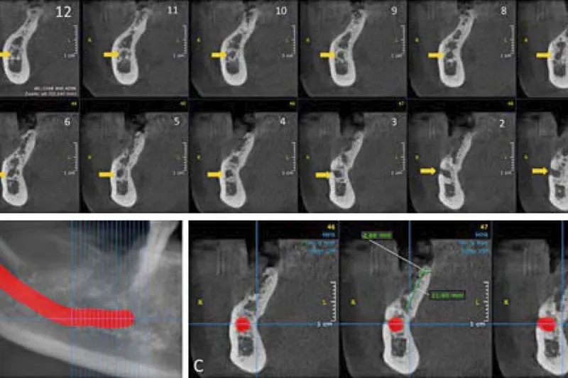 Atrofi af den posteriore mandibel byder på udfordringer, når en eller flere manglende tænder ønskes erstattet med en implantatbaseret protetisk restaurering. Behandlingsstrategi afhænger af flere faktorer, herunder dimensionerne af processus alveolaris samt beliggenheden af relevante anatomiske strukturer i mundbunden og mandiblen. Lokalisation af canalis mandibulae er således yderst vigtigt i forbindelse med implantatindsættelse i den atrofiske posteriore mandibel, da intraoperativ beskadigelse af n. alveolaris inferior vil medføre neurosensoriske forstyrrelser bl.a. svarende til hagen og underlæben. Omhyggelig behandlingsplanlægning inklusive radiologisk identifikation af canalis mandibulae er derfor afgørende for valg af relevant behandlingsmodalitet ved protetisk rehabilitering af den atrofiske posteriore mandibel og at gennemføre behandlingen med et forudsigeligt og sikkert behandlingsresultat med god langtidsprognose og mindst mulig risiko for komplikationer. I nærværende oversigtsartikel gennemgås forskellige metoder til vurdering af det tandløse område posteriort i mandiblen før implantatbehandling, herunder røntgenundersøgelse med særlig fokus på anvendelse af CBCT til lokalisering af canalis mandibulae.